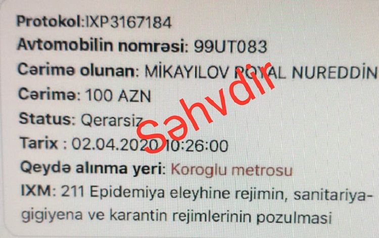 Aranxeber APA-ya istinadən xəbər verir ki, İdarənin İctimaiyyətlə əlaqələr şöbəsinin rəisi, polis polkovniki Kamran Əliyev məsələya aydınlıq gətirərək bildirib ki, sosial şəbəkələrdə guya şəhərdə hərəkətdə olan avtonəqliyyat vasitələrinə kameralar vasitəsi ilə cərimə tətbiq edilməsi barədə yayılan məlumatlar əsassızdır və həqiqəti əks etdirmir: “Xüsusi karantin rejimi dövründə hərəkətdə olan nəqliyyat vasitləri Yol Patrul Xidməti əməkdaşları tərəfindən saxlanılır. Araşdırma aparılır, əgər həmin avtomobili idarə edən şəxs zərurət yaranmadan yola çıxıbsa onlar 100 manat dəyərində cərimə edilirlər”.
