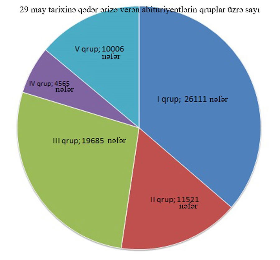 I qrup üzrə indiyə qədər 26111 (23869 nəfər Azərbaycan, 2242 nəfər rus bölməsi), II qrup üzrə 11521 (10359 nəfər Azərbaycan, 1162 nəfər rus bölməsi), III qrup üzrə 19685 (18272 nəfər Azərbaycan, 1413 nəfər rus bölməsi), IV qrup üzrə 4565 (3975 nəfər Azərbaycan, 590 nəfər rus bölməsi) nəfər ali məktəblərə sənəd verib.